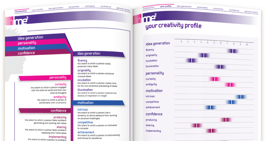 The me2 General Factor of Creativity report covers the psychology behind the 12 most important creative drivers along with specific areas for development.