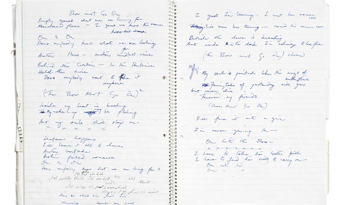 The notebook which he carried around between 1988 and 1990 contains lyrics for songs such as Too Much Love Will Kill You and The Show Must Go On – both songs loaded with extra poignancy given he had HIV at the time.
