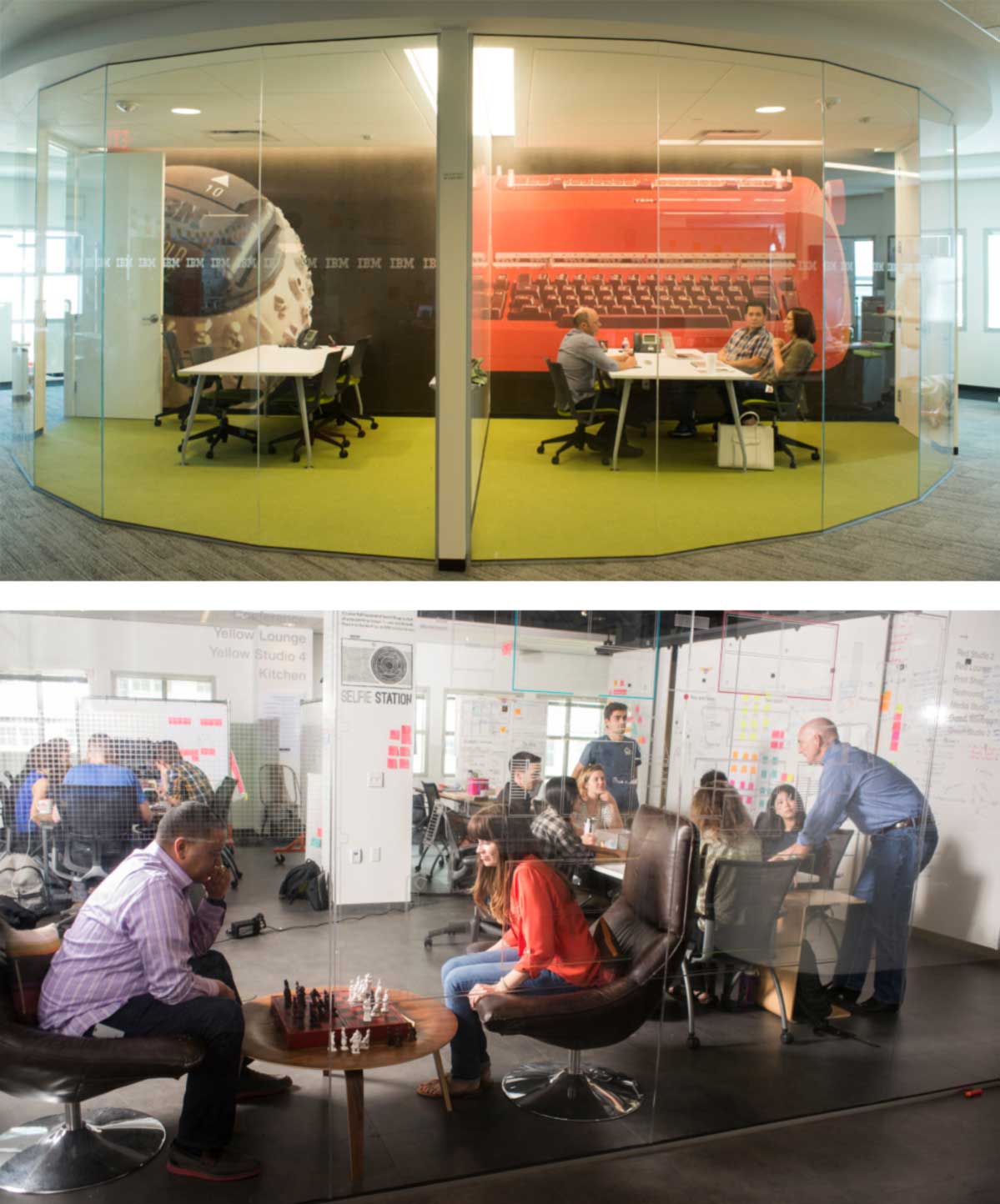 The incubator for the company’s experiment in corporate culture renovation with sprawling open-plan spaces, metal tracks fit movable whiteboard walls, creating temporary rooms — “huddle spaces” — for small teams of workers, rarely more than a dozen. The walls are covered with drawings, text and Post-it notes — “idea parking lots,” they’re called. The space constantly changes, as teams form or disband, add people or shed them, according to the nature of the work.
